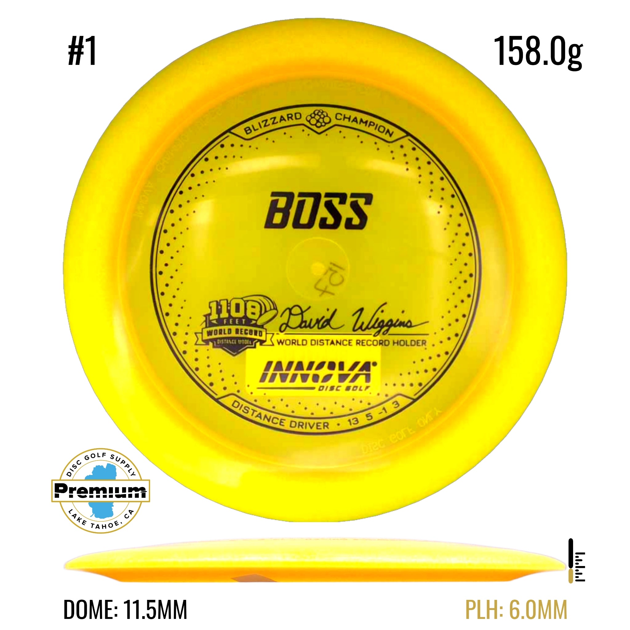 This is a fast stable driver that can handle full power throws and moderate headwinds. Advanced players and sidearm throwers will appreciate the dependable stability. The Boss has a slight high speed turn to help maximize distance with a predictable fade. David Wiggins Jr used a 154 gram R-Pro Boss to set the World Record 338 M (1108.92 feet) for the longest throw in March 2016. The Champion Boss flight numbers have been updated to better reflect the more stable flight. (13/5/0/3)