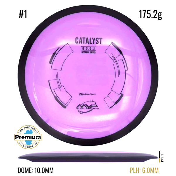 The Catalyst is a perfect starter for big distance. Its stability profile lends itself to being incredibly useful even when underpowered. Catalyst is similar to a longer Wave. High power throwers will be able to control rollers, sky anhyzers, and tight turns, while average to low power players will get easy distance with great glide, and a power-responsive amount of turn-to-straight. The Catalyst is molded with the same core and nice even dome as the Octane, yielding extra glide for maximum distance shots.
