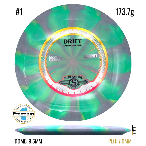 The Drift is designed for laser straight lines ending with a gentle fade and an exceptional amount of glide, providing easy distance with this highly versatile driver. The Drift has a modest rim size, a slightly domed profile, and an easily activated turn for hyzer-flips or big turnover shots. The Drift will make its grand debut in Neutron Plastic, pairing perfectly with its bright opaque colors, durability, and grip. This Speed 7 driver is the first fairway driver in the Streamline fleet and continues the trend of stunning triple-foil stock stamps.