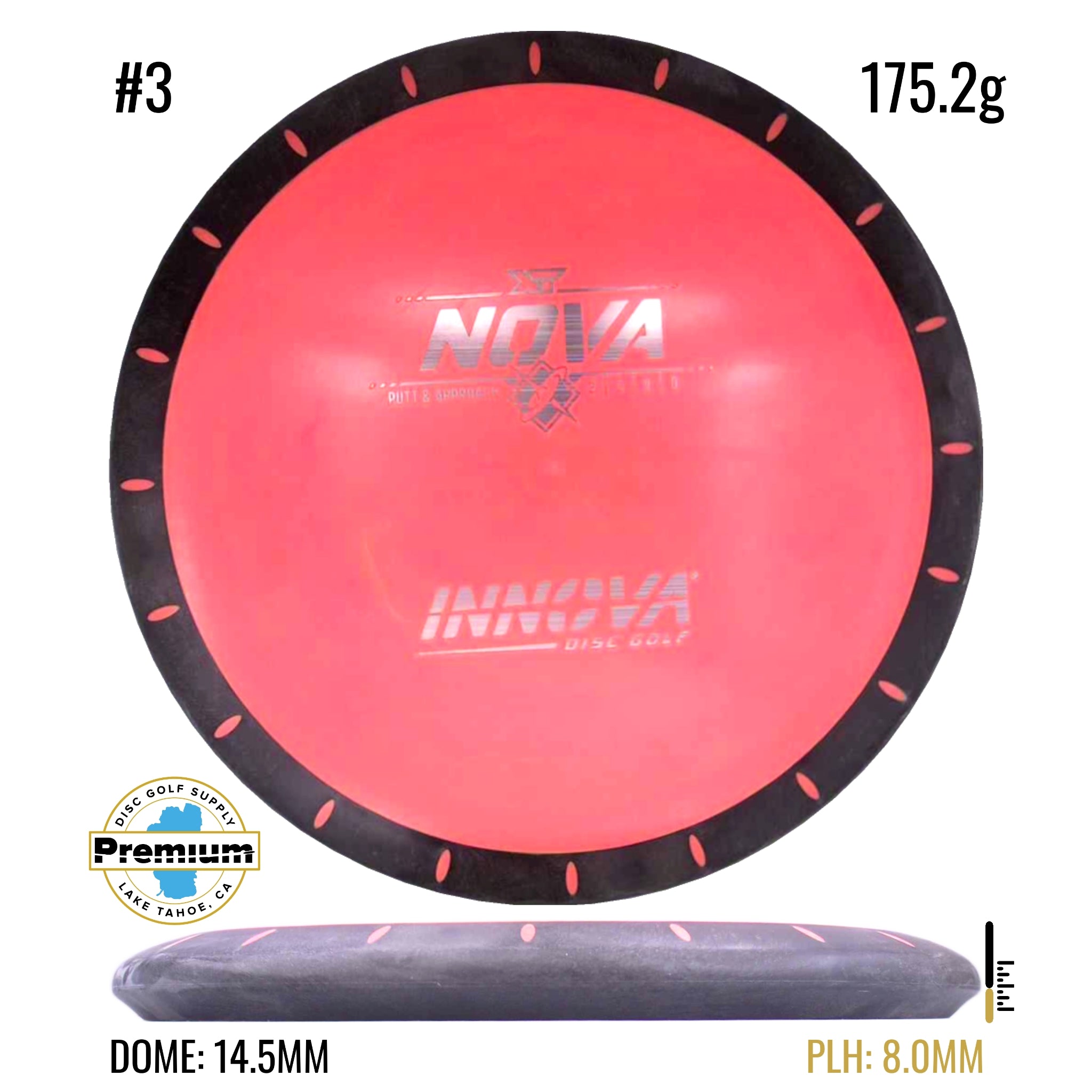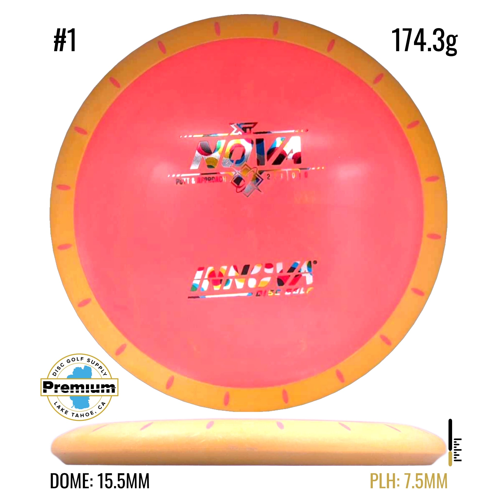 The Nova is a unique putter designed with overmold technology. The flight plate is made from a firm Pro material that's fused to a grippy putter Pro plastic rim. The soft rim absorbs impact and sticks the landing while the firm flight plate allows for powerful throws making the Nova an excellent putter and approach disc.